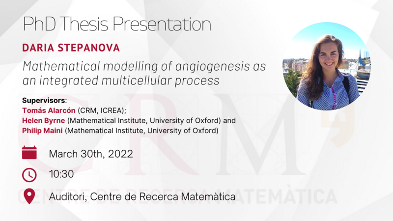 Daria Stepanova has conducted her PhD project as part of the Cancer Modelling Research Group at CRM, under the supervision of Tomás Alarcón (CRM, ICREA), Helen Byrne (Mathematical Institute, University of Oxford) and Philip Maini (Mathematical Institute, University of Oxford).