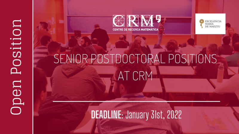 The Centre de Recerca Matemàtica (CRM) offers 5 senior postdoctoral positions funded by the María de Maeztu Unit of Excellence Award (2020)