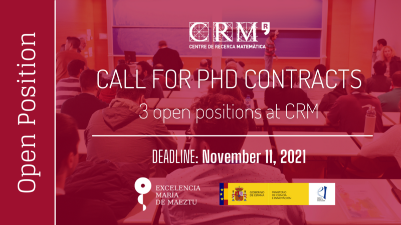 The Centre de Recerca Matemàtica (CRM) is looking for candidates for three predoctoral positions funded through the Formación de Programa Investigador (FPI) scheme, to carry out a PhD thesis in the framework of the CRM María de Maeztu Unit of Excellence research programme: